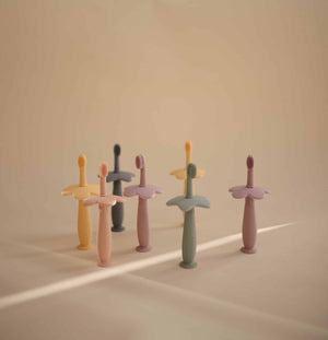 De Mushie Trainer tandenborstel helpt je om de eerste tandjes van je kindje precies, makkelijk, comfortabel en zachtjes te poetsen. Daarnaast helpt het je kindje spelenderwijs gewend te laten raken aan de goede gewoonte van het tandenpoetsen. Met de kleine, zachte haartjes aan de voorzijde poets je tandjes mooi schoon. De bobbeltjes achterop helpen je eventueel gevoelig tandvlees te masseren en ontspannen.