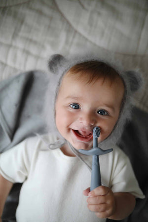 - Poets de tandjes van je baby met de siliconen haartjes op de borstel.
